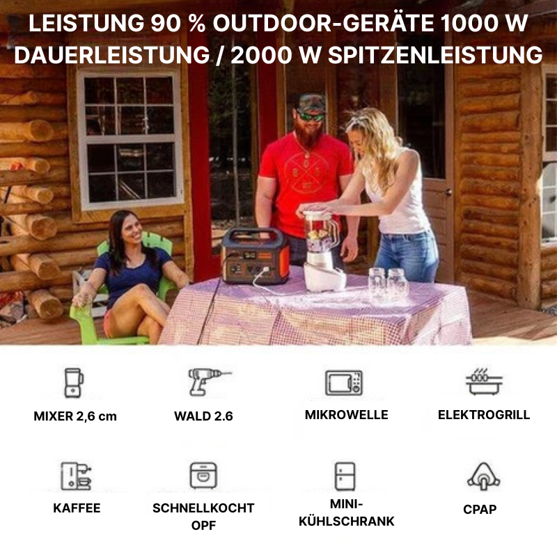 Die Nomadex liefert beeindruckende Leistung mit einer Lithium-Batteriekapazität von 1002 Wh (46,4 Ah) sowie einer Dauerleistung von 1000 W und einer Spitzenleistung von bis zu 2000 W. Dank der drei reinen Sinus-AC-Ausgänge sowie USB-C- und Quick-Charge-3.0-Anschlüssen versorgt sie zuverlässig eine Vielzahl elektrischer Geräte mit stabiler Energie.