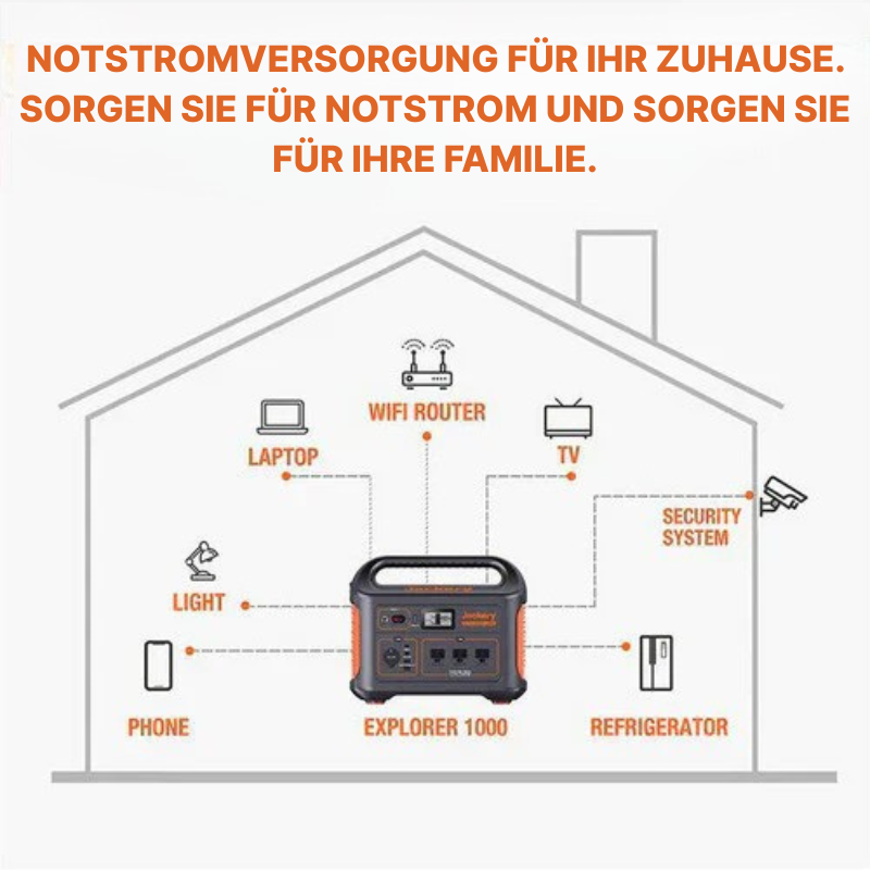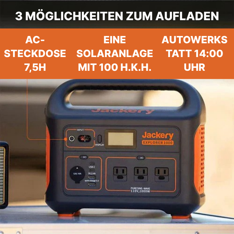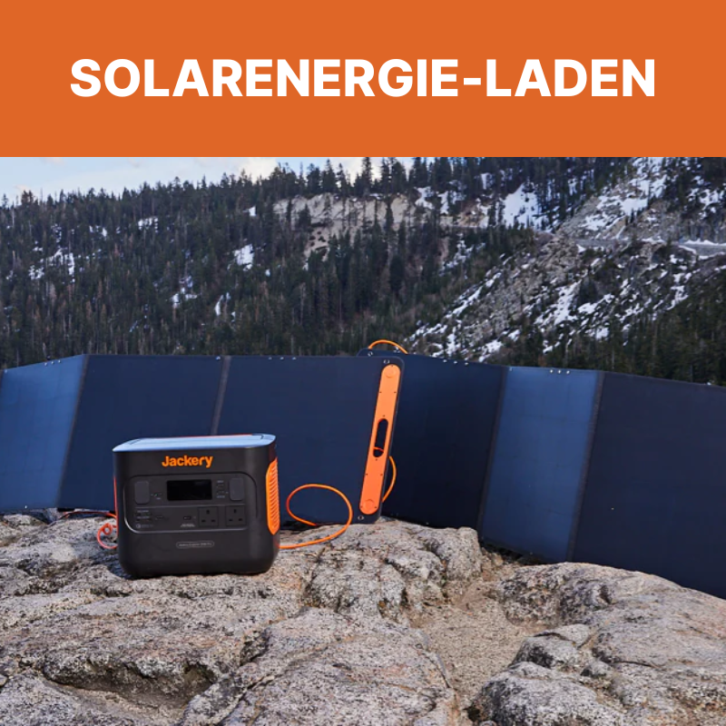 - Ladeoptionen: Solarmodul, Steckdose, 12-V-Fahrzeuganschluss, Generator