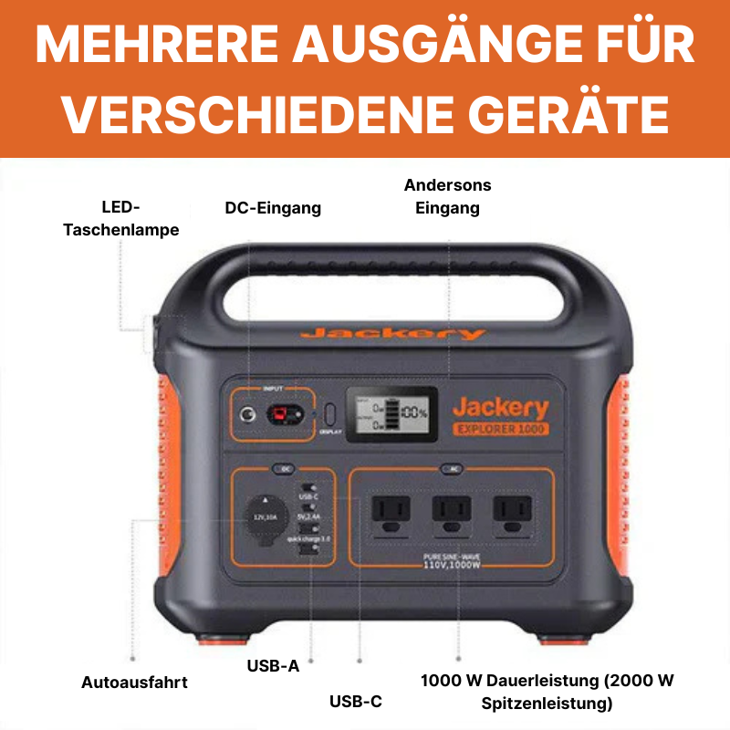 - Anschlüsse: 3 × AC-Ausgänge mit reiner Sinuswelle, 2 × USB-C, 1 × Quick Charge 3.0